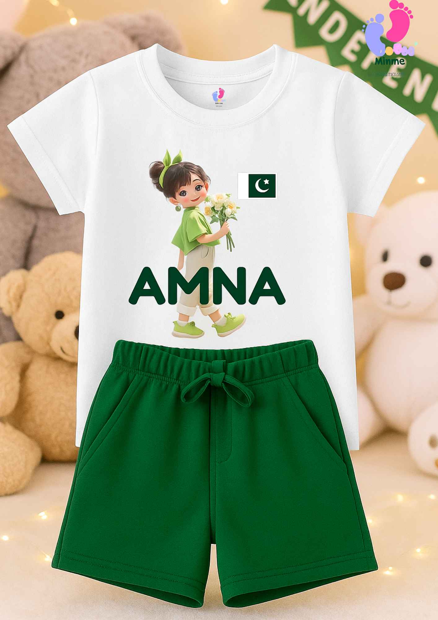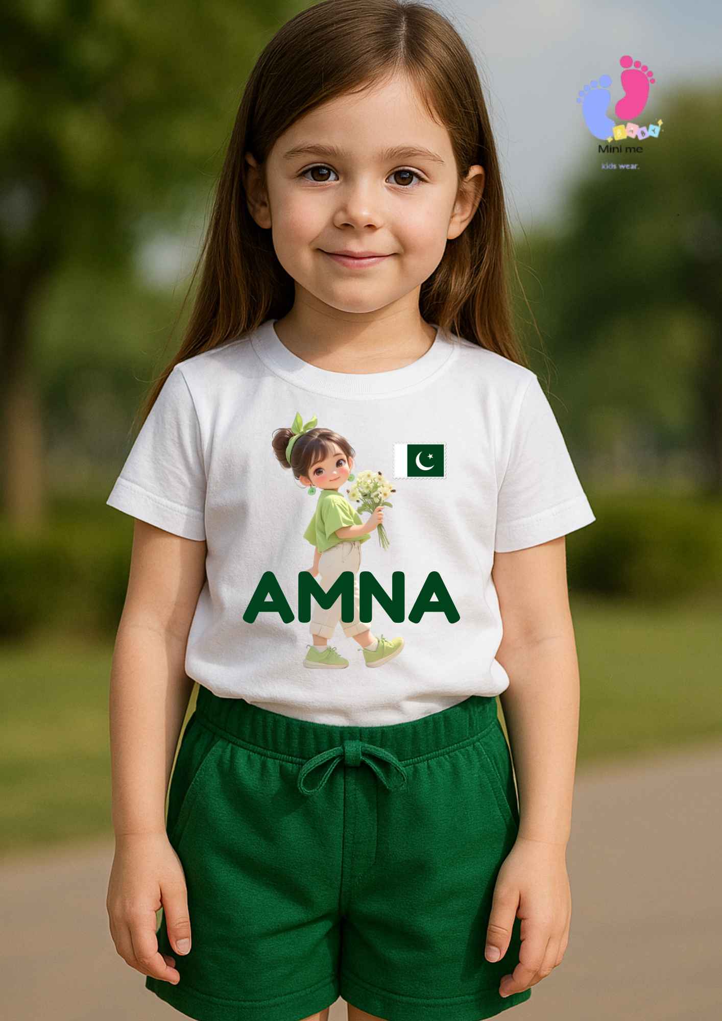 Let your little princess celebrate Independence Day in style with this adorable custom name t-shirt featuring a charming cartoon girl illustration, Pakistan flag, and her own name printed in bold!